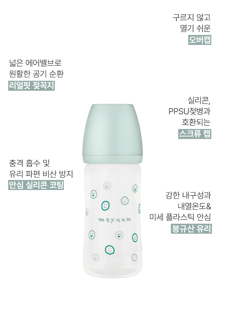 + Bình sữa Moyuum thủy tinh có thể rơi vỡ ngay cả khi va chạm nhẹ, vì vậy nên kiểm tra bên ngoài và bên trong bình xem có vỡ hoặc rạn không trước khi sử dụng. Nếu có dấu hiệu bất thường, ngưng sử dụng ngay.