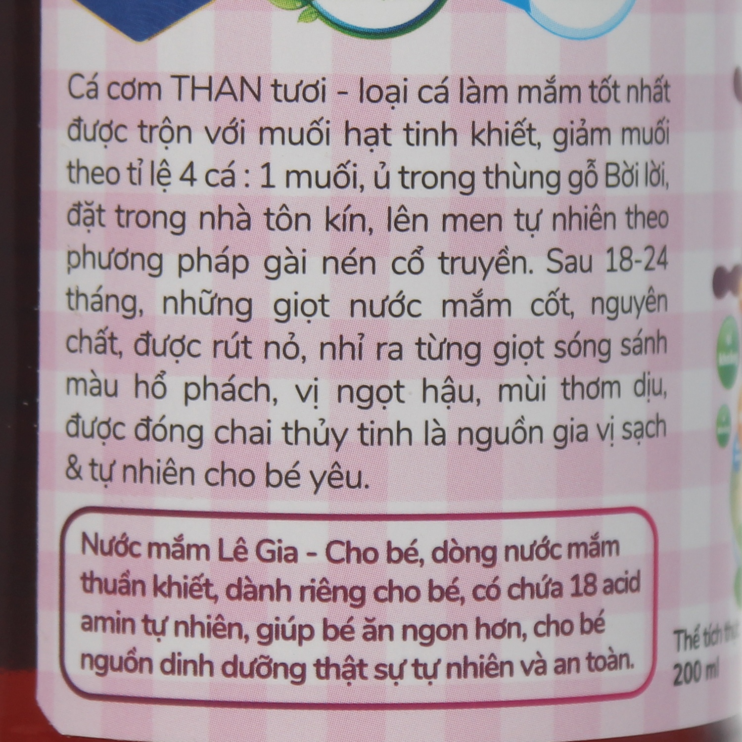 Nước mắm cá cơm Lê Gia 200ml được làm từ cá cơm Than đánh bắt đúng thời vụ, béo mập, tươi ướp muối ngay khi lên bờ, bảo đảm giữ trọn vẹn hương vị và giá trị dinh dưỡng và được ủ với lượng muối hạt tinh khiết theo tỉ lệ 4:1 (4 cá 1 muối) để phù hợp với trẻ nhỏ. Để chế biến ra một chai nước mắt cá cơm Lê Gia thơm ngon, hấp dẫn phải trải qua rất nhiều công đoạn từ việc ủ cá với muối tinh trong thùng gỗ Bời Lời, sau đó đặt dưới nhà tôn kính theo phương pháp truyền thống từ 18 – 24 tháng, để lên men hoàn toàn tự nhiên. Thành quả tạo ra đó là những dòng nước cốt, nguyên chất, được rút nỏ, nhỉ ra từng giọt sóng sánh có đỏ tươi màu hổ phách, mùi thơm dịu, vị đậm đà và cuối cùng được đóng thành từng chai chắc chắn dành riêng cho trẻ nhỏ.