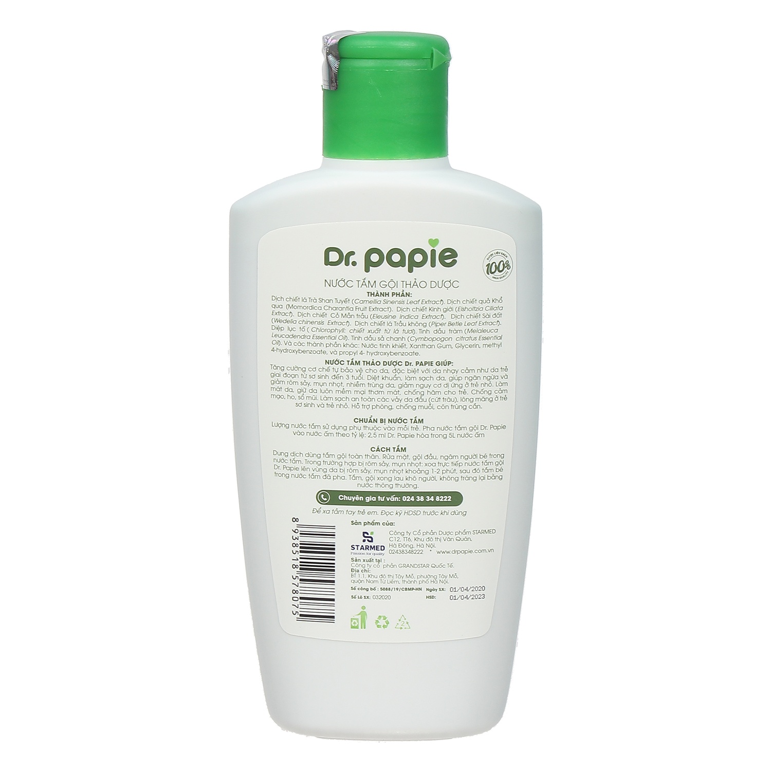 - Nước tắm gội thảo dược Dr Papie là sản phẩm sử dụng nguồn nguyên liệu thảo dược hữu cơ sạch từ thiên nhiên, mang đến cho bé dòng sản phẩm tiện lợi 2 trong 1, vừa là dầu gội, vừa làm sữa tắm thật an toàn và nhẹ dịu, lành tính. Sữa tắm Dr Papie không gây cay mắt cho bé.