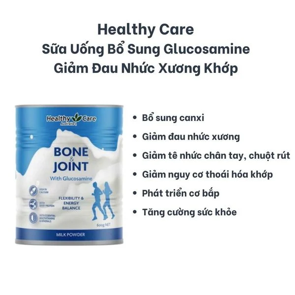 ➤ Sữa bổ xương khớp bone and joint của Healthy Care của Úc đang được yêu thích trên thị trường. Dòng sữa bổ sung canxi hàm lượng cao, cùng vitamin D3, glucosamine, các khoáng chất: magie, kẽm, selen,… giúp tăng cường sức khỏe của khớp xương, ngăn ngừa loãng xương, giảm cơn đau nhức khớp, chuột rút, tê chân tay,…