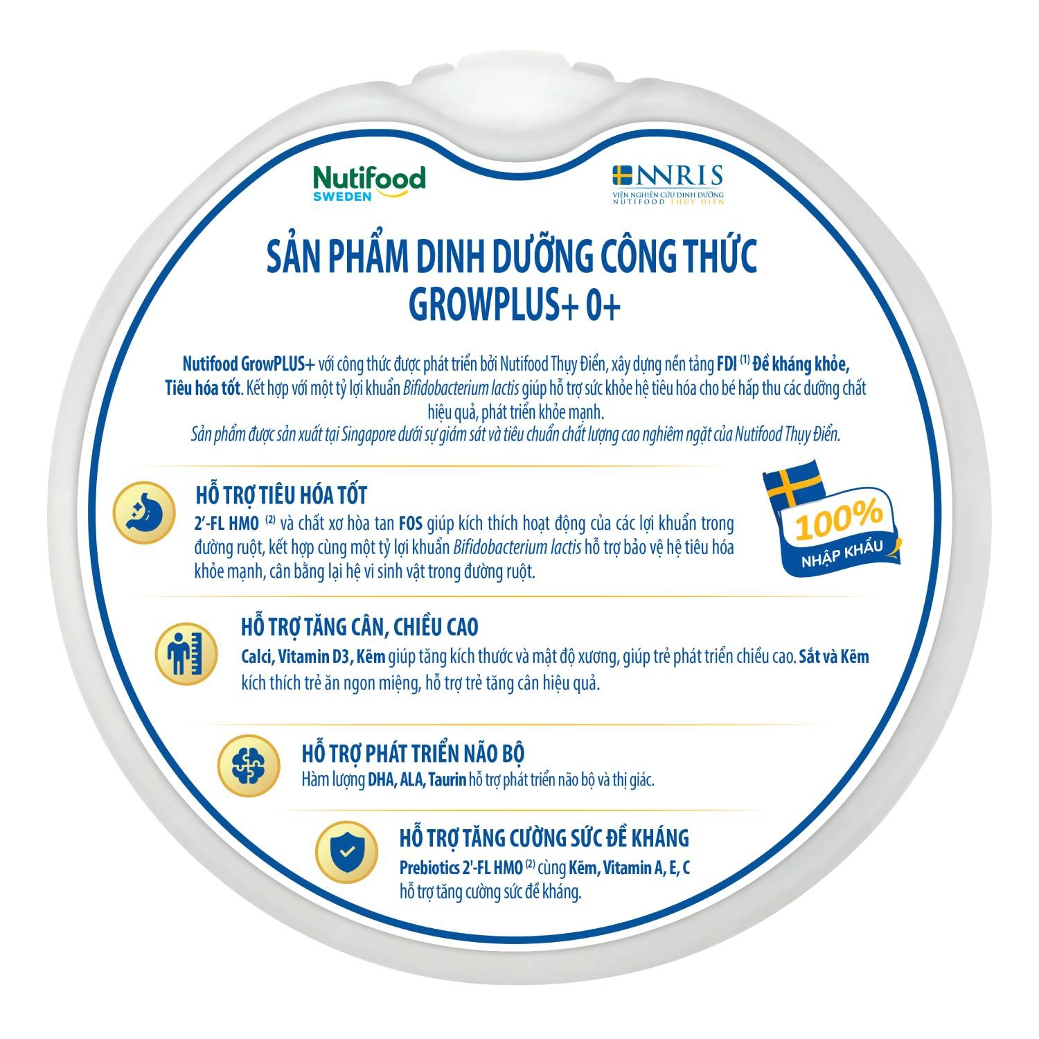 Bột sữa (bột whey, sữa bột, dầu thực vật (dầu hạt cải, dầu bắp, dầu dừa, dầu hướng dương), lactose, inositol, taurin), chất xơ thực phẩm (FOS), vitamin và khoáng chất (magnesi clorid, kali clorid, kali citrat, natri citrat, riboflavin, kali hydro phosphat, calci carbonat, natri hydro phosphat, natri clorid, magnesi oxyd, såt pyrophosphat, natri L-ascorbat, kẽm sulphat, mangan sulphat, DL-alpha-tocopheryl acetat, natri selenit, dồng sulphat, cholecalciferol, niacinamid, retinyl acetat, caldi D-pantothenat, acid folic, kali iodid, D-biotin, phylloquinon, cyanocobalamin, pyridoxin hydroclorid, thiamin mononitrat, L-camitin tartrat, thiamin hydrodorid), acid arachidonic (ARA, từ dầu M. alpina), acid docosahexaenoic (DHA, từ dầu cá), 2′-Fucosyllactose (2-FL), probiotics (Bifidobacterium lactis) (B.lactis). Có chứa sữa, đậu nành, dầu cá.