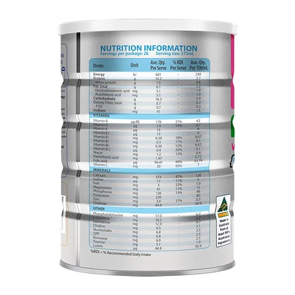 Sữa bột (sữa tách béo, sữa nguyên kem, Lactose), bột whey protein, Axit arachidonic (ARA), Axit Docosahexaenoic (DHA), Fructo-oligosaccharide (FOS), Canxi Carbonate, Ferrous Sulphate, Magnesium Chloride, Zinc Sulphate, Potassium lodide, Potassium Chloride, L-ascorbic Acid, Vitamin A Acetate, Niacinamide, Calcium Pantothenate,