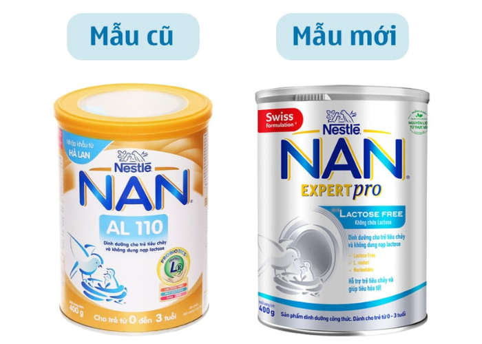 - Sữa có thiết kế 2 bao bì: Sữa bột NAN AL 110 400g (0 – 36 tháng) (mẫu cũ) và sữa bột NAN Expert Pro Lactose Free 400g (0 – 36 tháng) (mẫu mới). Thành phần dinh dưỡng 2 mẫu giống nhau, tuy nhiên mẫu mới bổ sung thêm nhiều dưỡng chất hơn so với mẫu cũ.