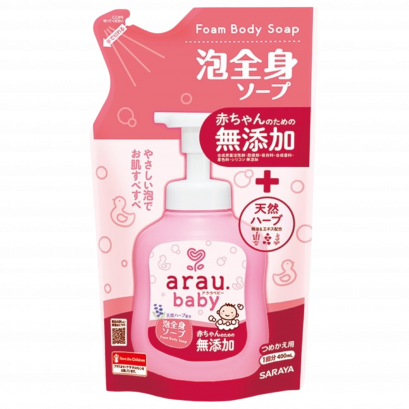 Sữa tắm trẻ em Arau Baby 400ml dạng túi cho bé chất hoạt động bề mặt gốc sinh học bio surfactant (công thức độc quyền saraya, đã có trong thành phần nước rửa bình) rửa sạch và trôi nhanh không để lại dư lượng trên da, tăng độ ẩm cho da nhờ thành phần chiết xuất lô hội