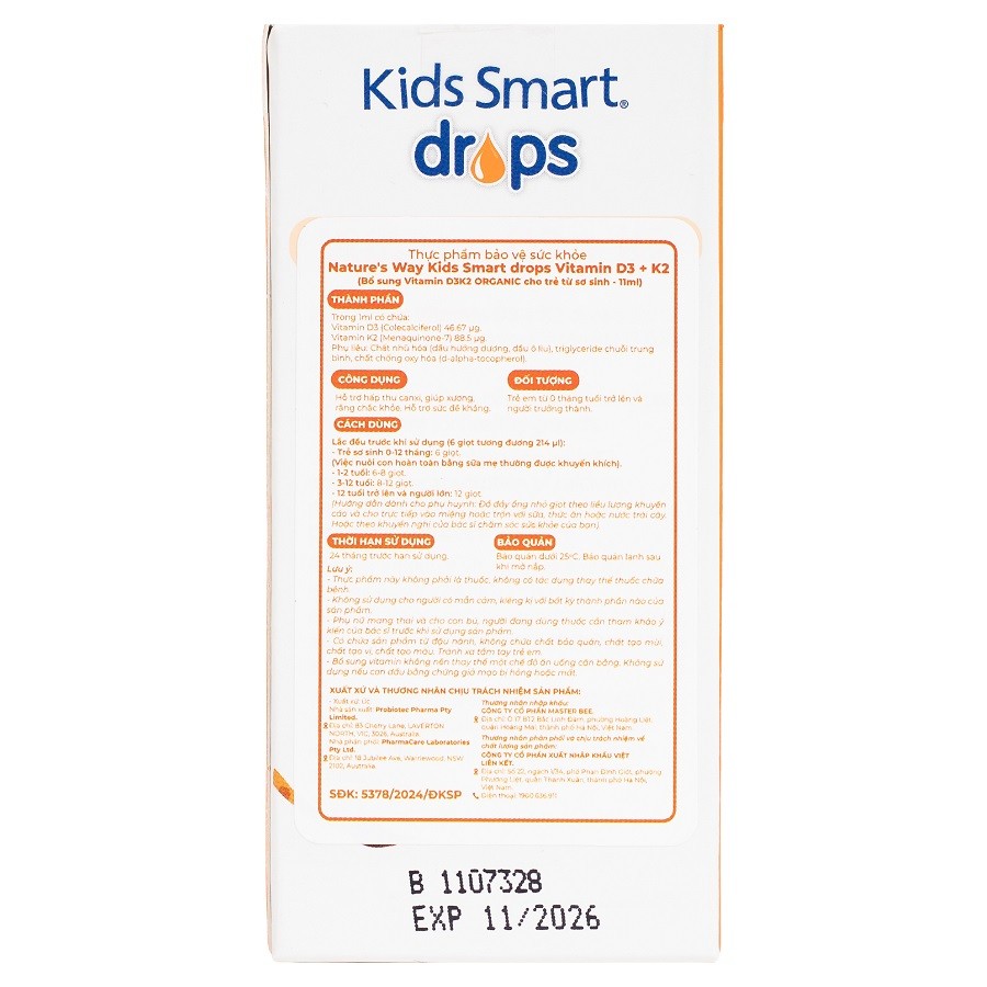 Vitamin D3 + K2 Nature’s Way Kids Smart Drops là sản phẩm bổ sung vitamin D3 và K2 giúp hỗ trợ hấp thụ canxi, tăng cường sức khỏe xương, răng và hệ miễn dịch cho trẻ em và người lớn. Với công thức đặc biệt kết hợp hai dưỡng chất quan trọng, sản phẩm giúp đảm bảo sự phát triển toàn diện và vững chắc của hệ xương ngay từ những năm đầu đời.
